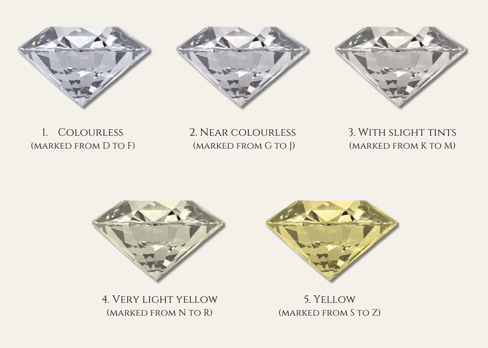 Diamond colour is a reflection of rarity and value. The colour of a diamond is marked alphabetically and ranges from: